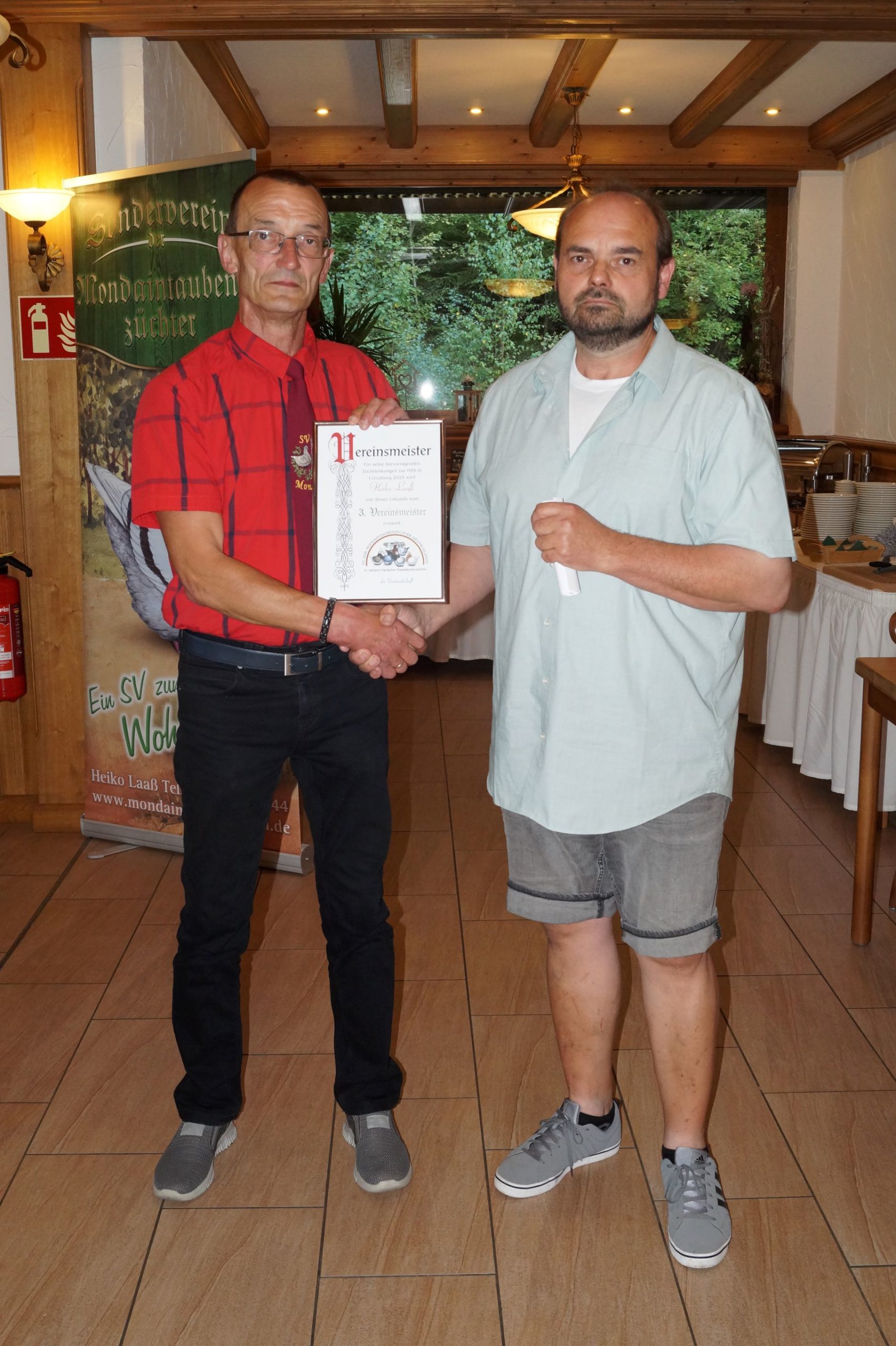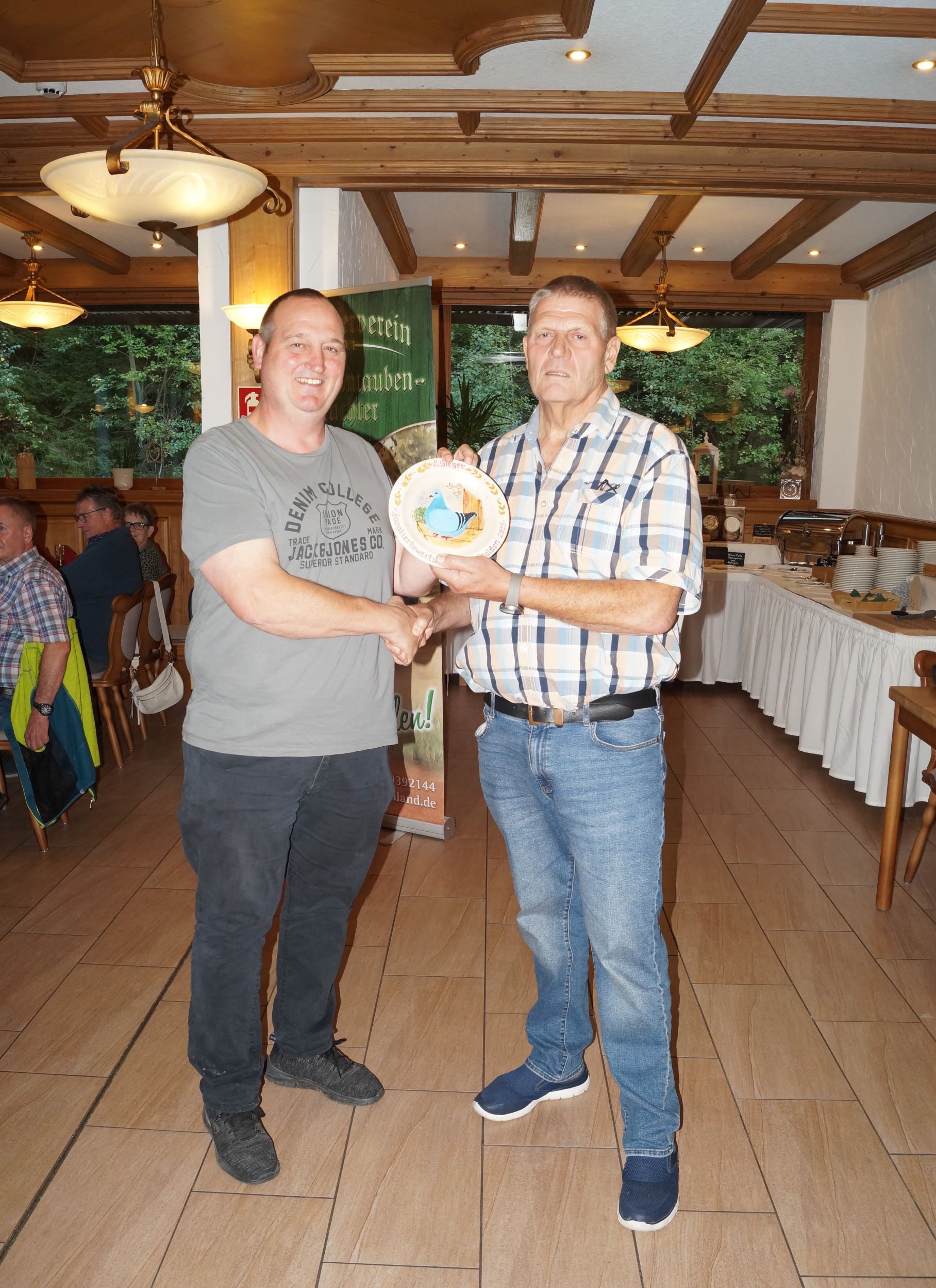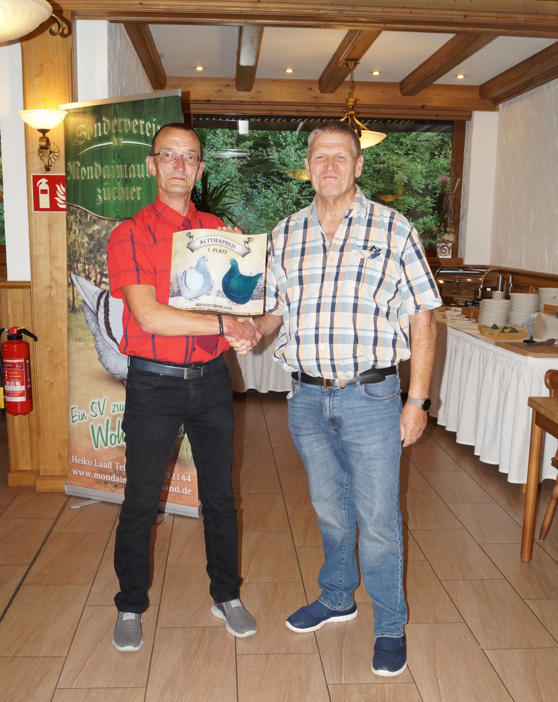 Gegen 18 Uhr trafen sich dann Männlein und Weiblein zum gemütlichen Beisammensein beim Züchterabend. Schon bevor das Abendessen serviert wurde, begannen Heiko, Christian und Dietmar mit der Preisverteilung. Unser Zuchtwart Dietmar gab die Sieger der JTB bekannt und überreichte dekorative Holzteller. Der 3. Platz ging an eine blaue von Christian, der 2. Platz ging an eine blaue von Enrico Lorenz, der 1. Platz ging an eine schwarze von Christian.