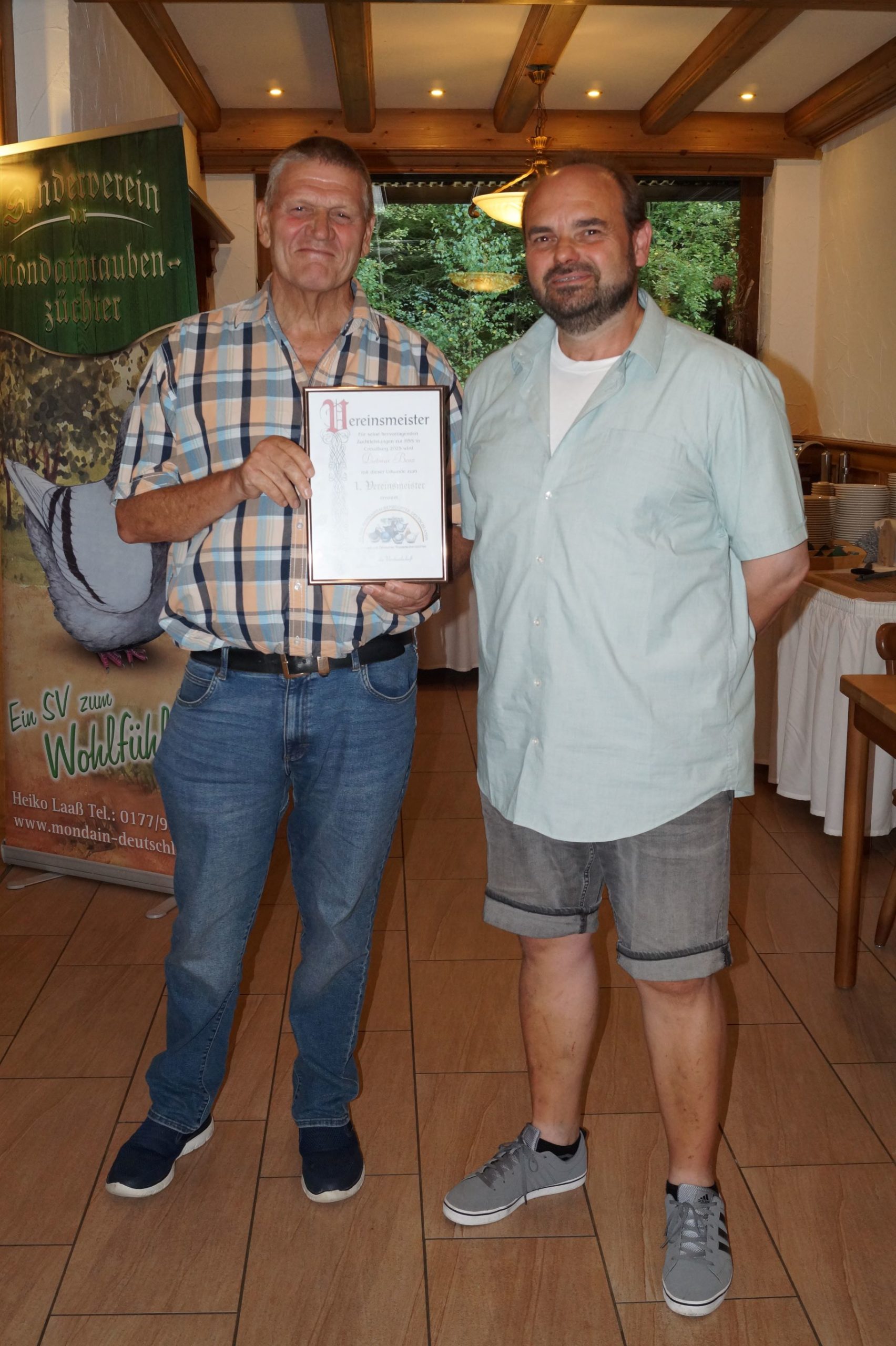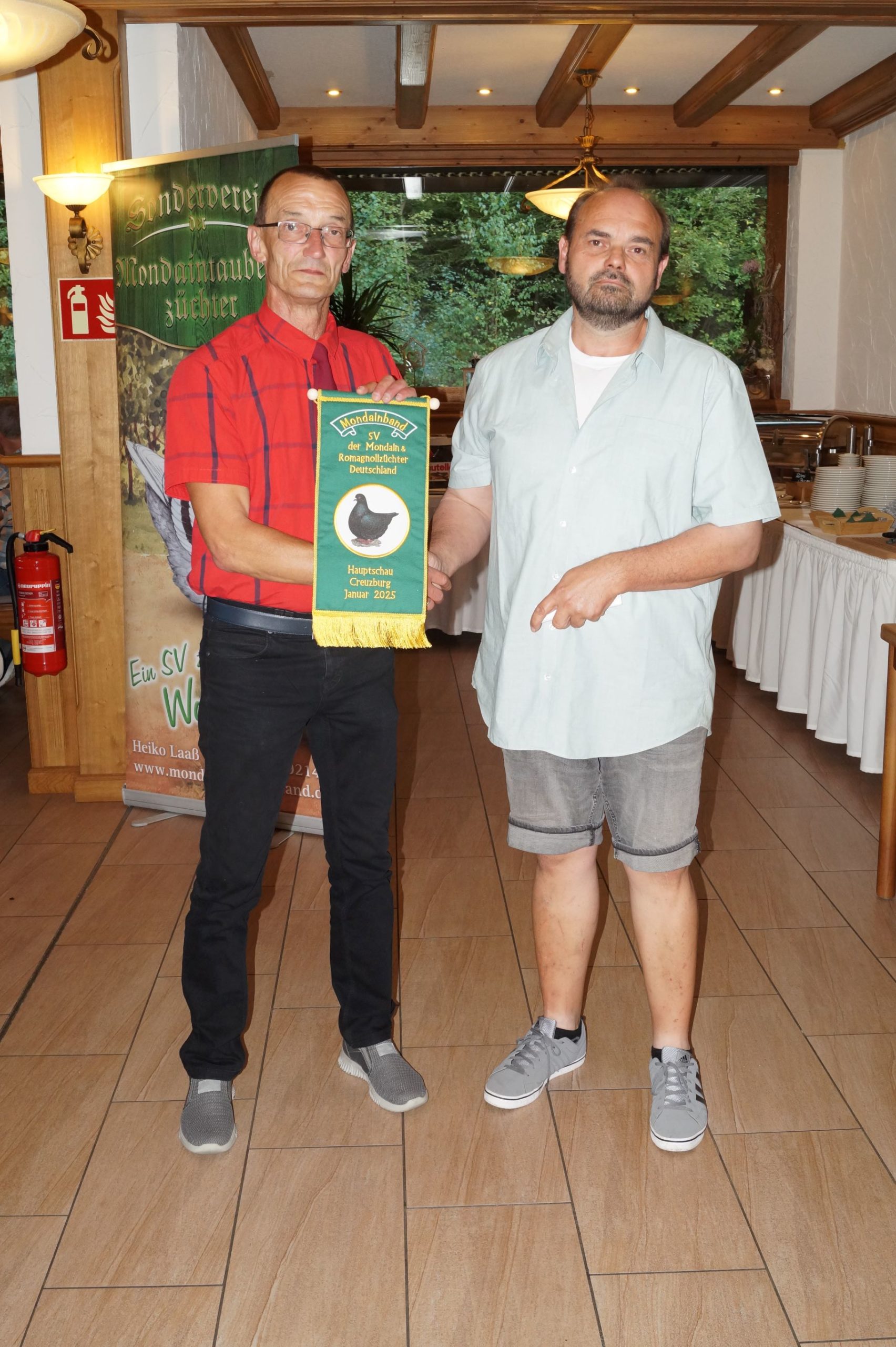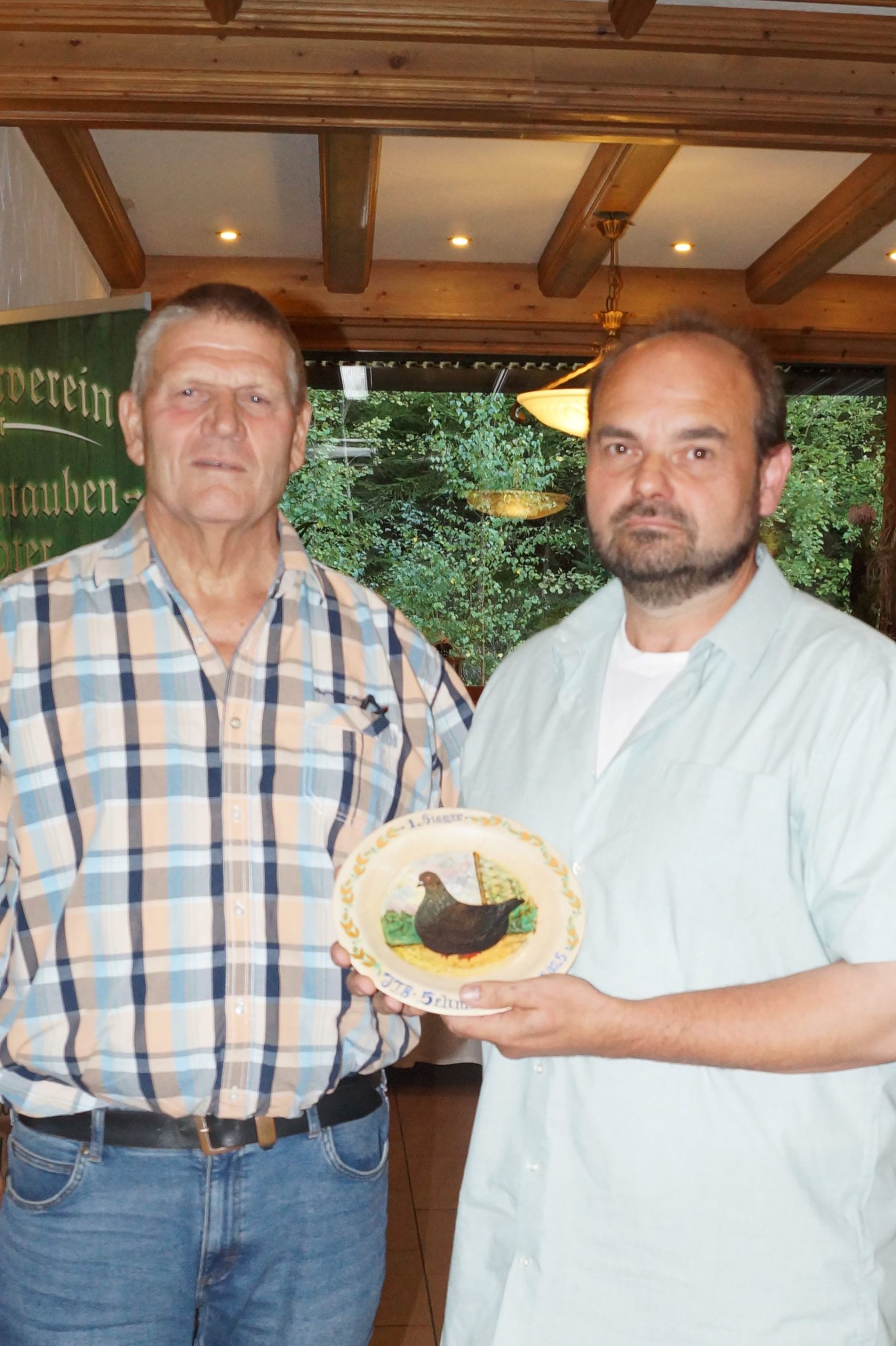 Gegen 18 Uhr trafen sich dann Männlein und Weiblein zum gemütlichen Beisammensein beim Züchterabend. Schon bevor das Abendessen serviert wurde, begannen Heiko, Christian und Dietmar mit der Preisverteilung. Unser Zuchtwart Dietmar gab die Sieger der JTB bekannt und überreichte dekorative Holzteller. Der 3. Platz ging an eine blaue von Christian, der 2. Platz ging an eine blaue von Enrico Lorenz, der 1. Platz ging an eine schwarze von Christian.